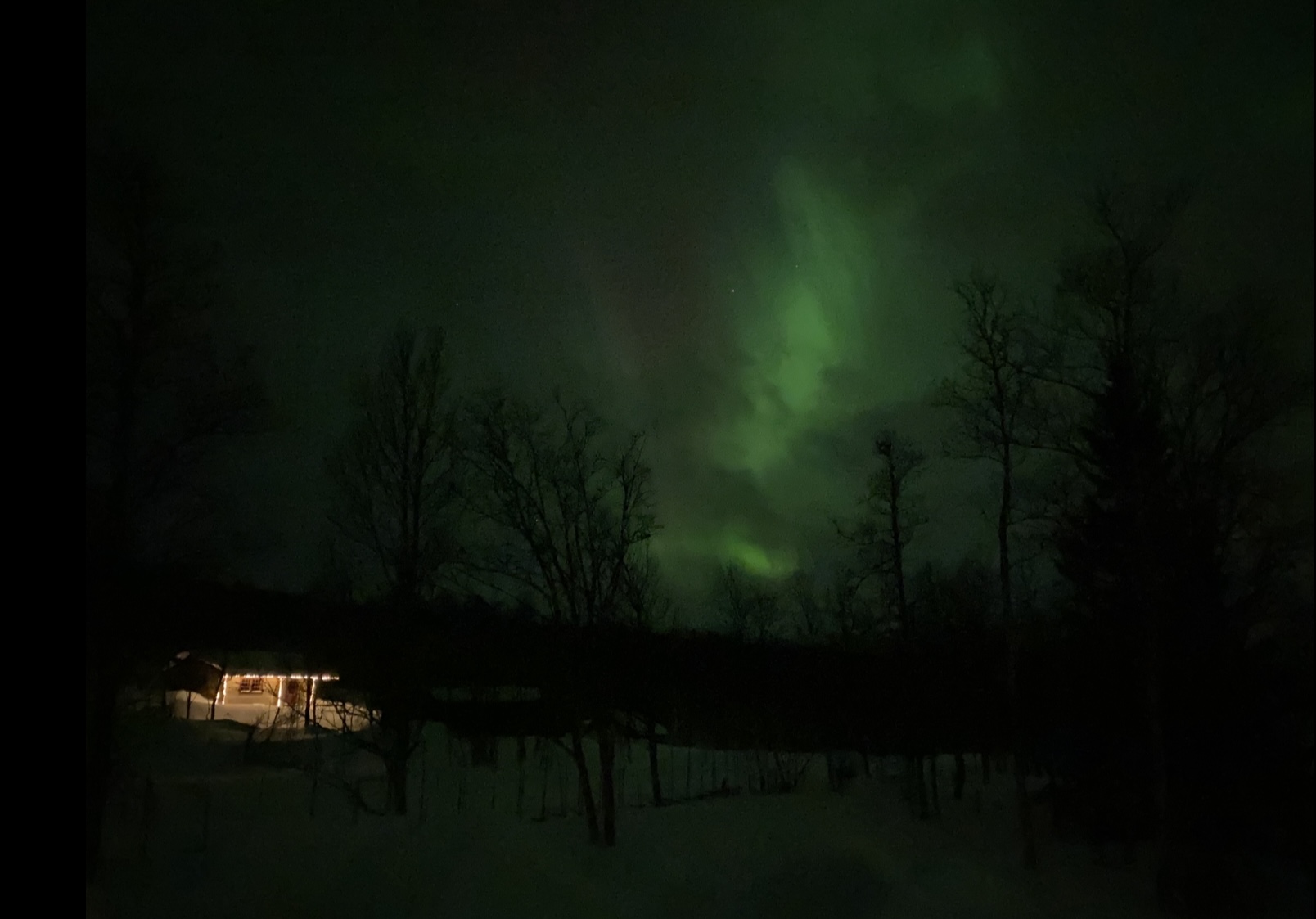 Fantastiskt norrsken i grönt men också lite rött 🙂