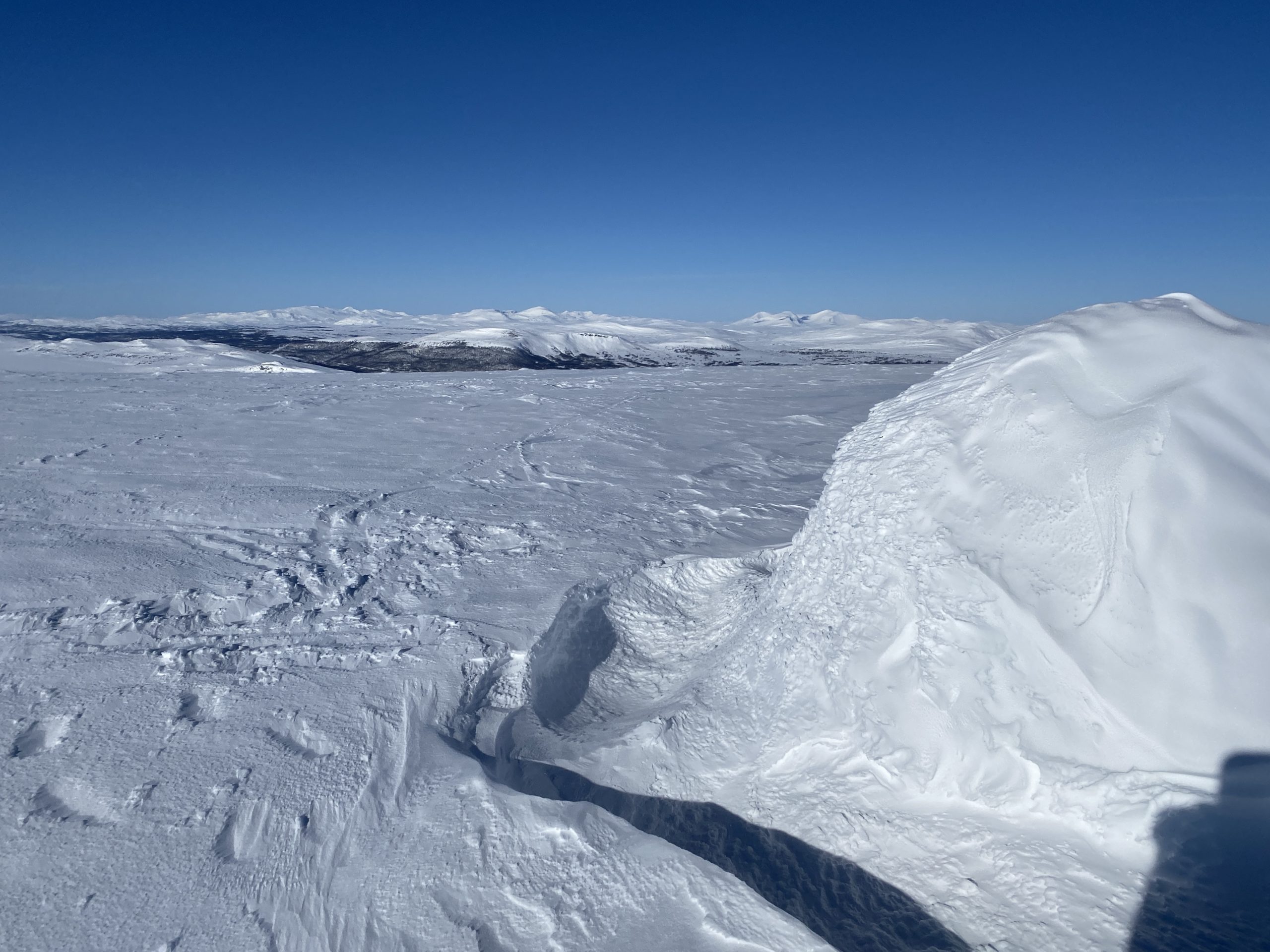 Äntligen sol och det blev en fin tur men lite kylig vind. Ca 20 graders lutning på norrsidan av Rödfjellet där jag åkte ned. En del sten och skravel att väja för men också många härliga carvingsvängar i packad snö.